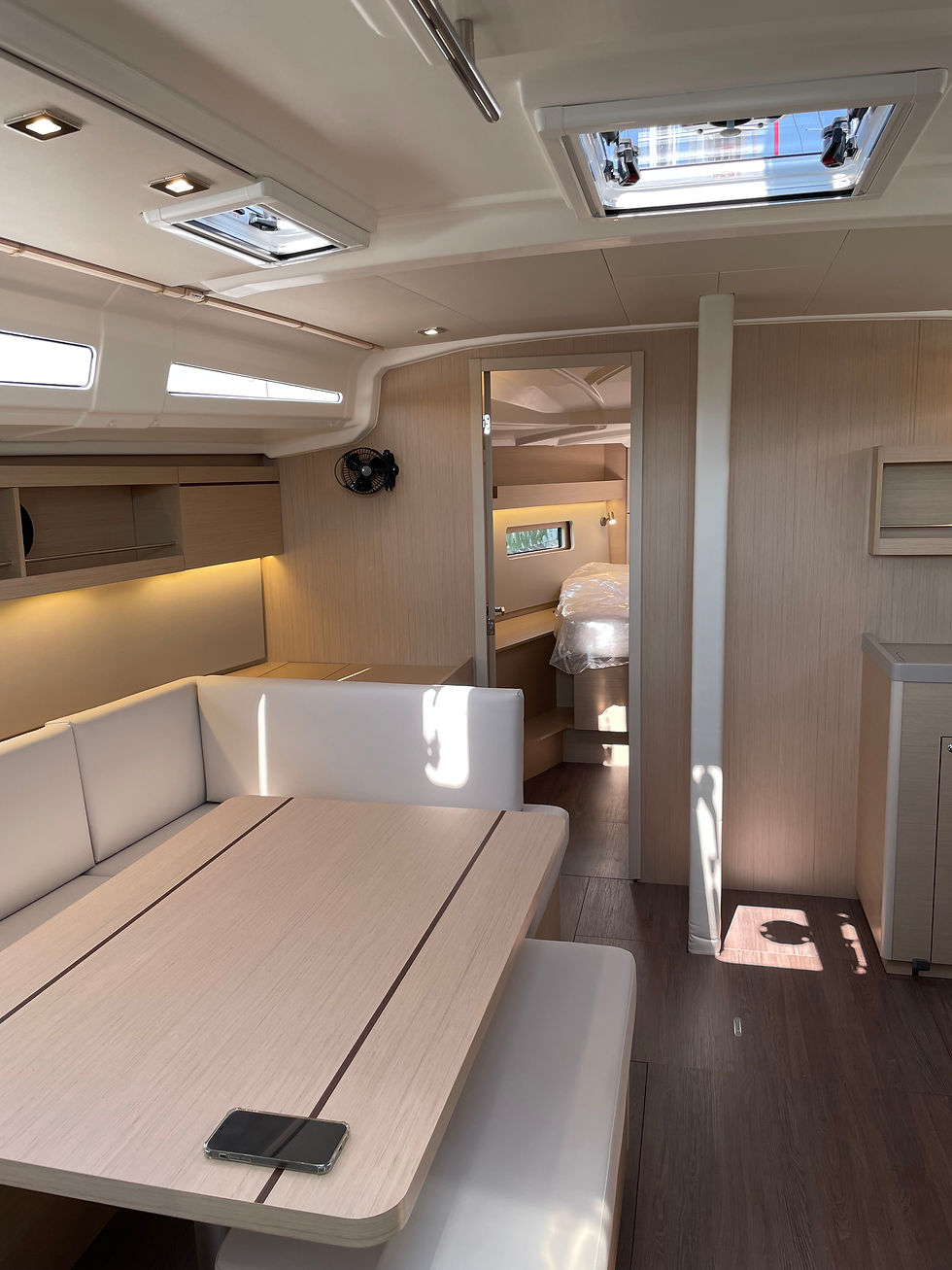 She is 11.99m LOA, but 12.89m with the bowsprit. She draws 2.2m and her beam is 4.2m. She has a roller furling 105% genoa (34 sq. m) and an in-mast furling mail (34 sq. m). As she is twin wheel and twin rudder, she has no prop-wash effect, so she has a retractable bow-thruster.